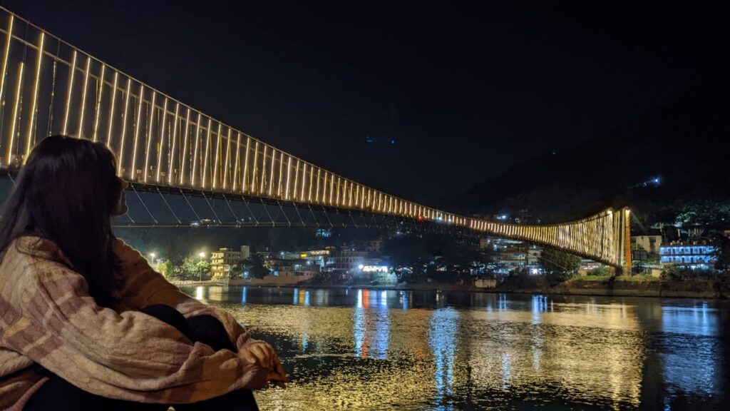 On my last day after dinner, I thought to walk toward Ram Jhula Parmath ghat. It was 8 pm so the aarti crowd was over and the ghat was very silent. To make you visualize what the ghat looks like, imagine the Ganga river, on top of that is a bridge on which sits a beautiful idol of Lord Shiva, and in front of the bridge are the stairs where people can sit and attend aarti.